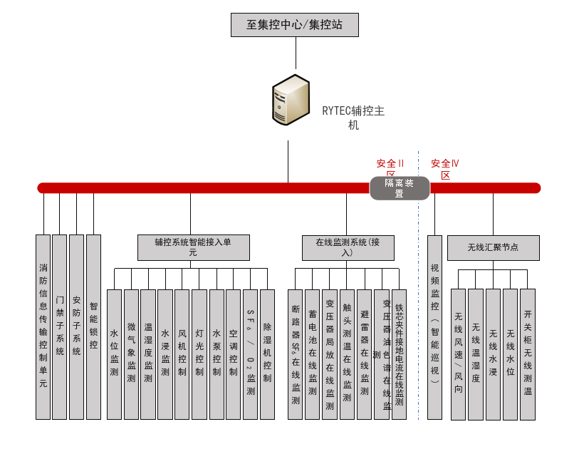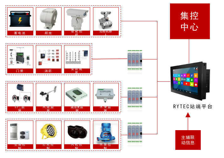 RYTEC变电站辅助设备监控系统满足电网公司对变电站辅助设备运维的最新规范性要求。该系统集成了变电站在线监测(变压器、GIS、断路器、避雷器等在线监测)、消防、安全防范、动力环境监测、智能锁控、门禁、智能巡视等子系统,为变电站综合监控提供支撑。